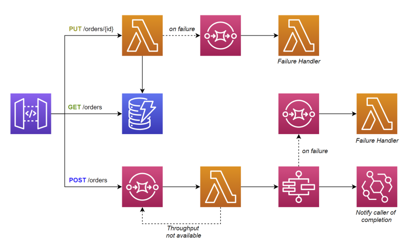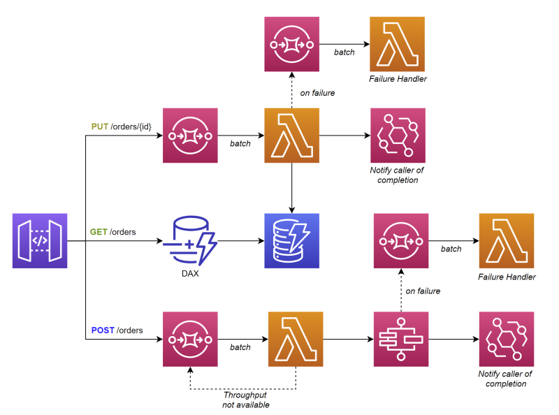 The architecture has been modified slightly. We still have endpoints that connect to Lambda and DynamoDB, but we no longer connect to Step Functions directly. Instead, we put an SQS queue in front of it to act as a buffer. This inadvertently makes the endpoint asynchronous.