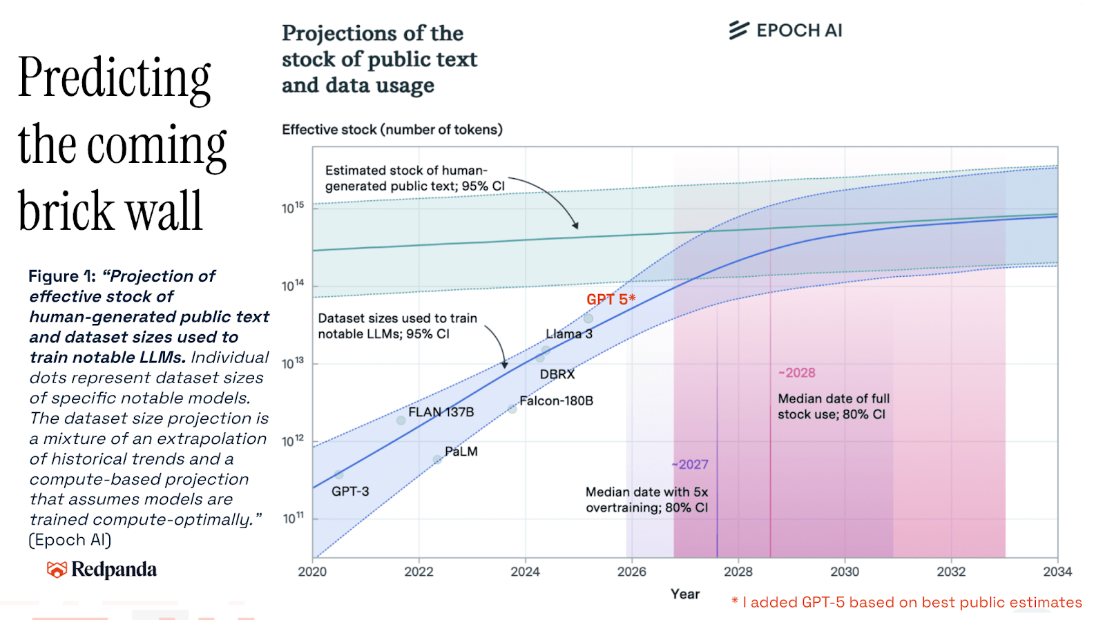 Epoch AI did an analysis in 2024, and I updated their graphic by plotting the best estimate of where we are with ChatGPT 5.x. Simply put: frontier AI models are running out of public data to train against.