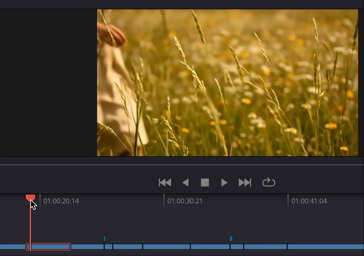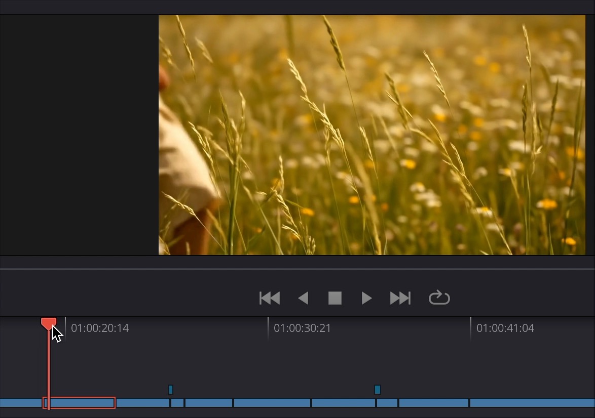 I dropped the sped-up clip into my timeline on the Edit page in DaVinci Resolve. Next, I needed the shot of the grass frozen in time. This kind of effect, where the camera is moving but the scene is frozen, is often called a "bullet time" effect, after its revolutionary use in The Matrix: