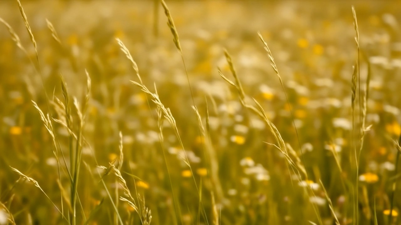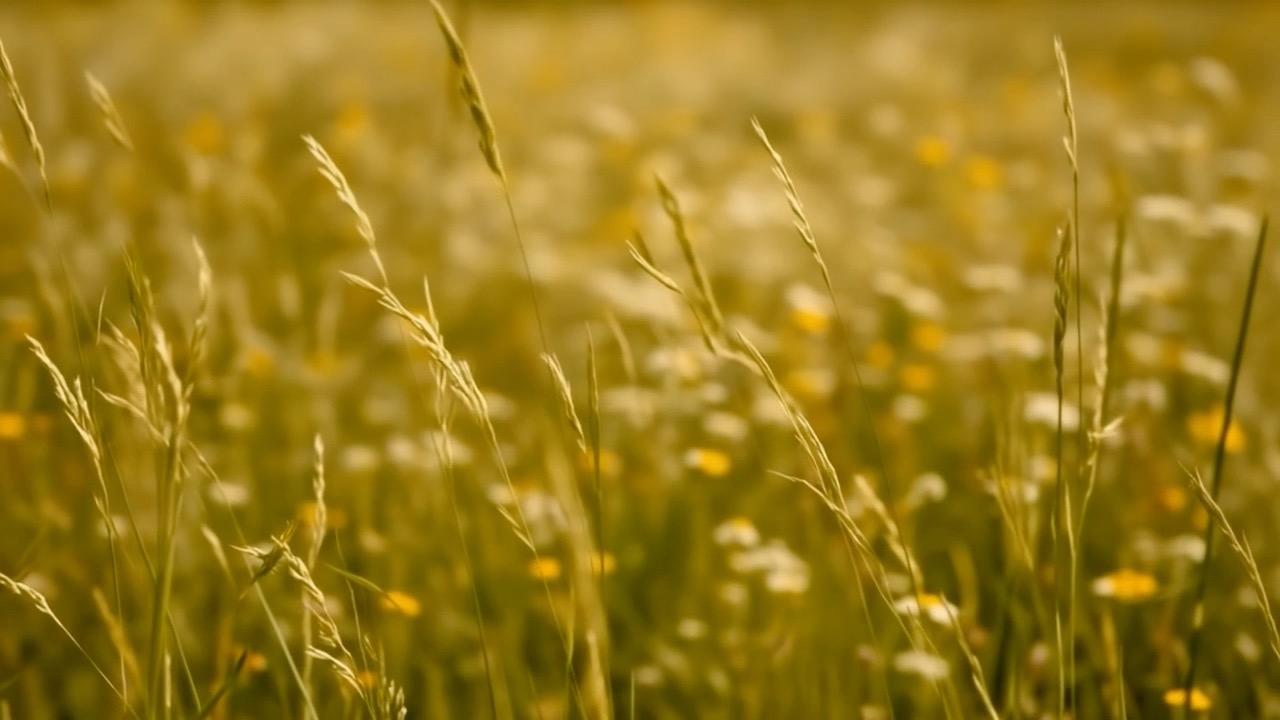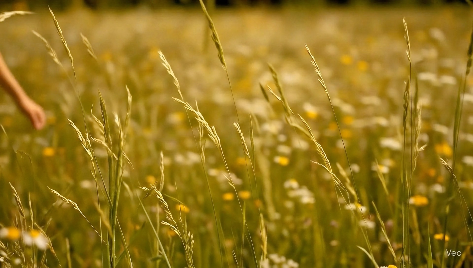 Instantly cut from the reference still to a new shot. A macro cinematic close-up of tall grasses in a wildflower meadow, swaying gently in a light breeze. The camera is very close to the grasses, shallow depth of field, golden natural sunlight. Into the frame, the same young woman from the first frame runs and dances past. Only her waist, skirt, and hand are visible as she brushes her fingers through the grasses. The fabric of her flowing beige dress and puffed patterned sleeves catches the air as she moves. Her hand is graceful, adorned with simple jewelry. The motion feels tactile, immersive, and naturalistic, with the grasses bending softly to her touch. Cinematic, macro lens, shallow depth of field, photoreal, warm sunlight, poetic atmosphere.