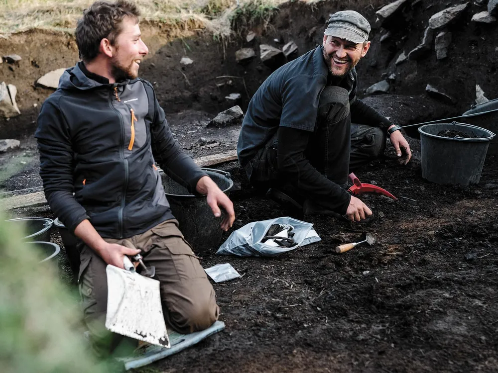 Gardar’s ruins occupy a small fenced-in field abutting the backyards of Igaliku, an Inuit sheep-farming community of about 30 brightly painted wooden houses overlooking a fjord backed by 5,000-foot-high snowcapped mountains. No roads run between towns in Greenland—planes and boats are the only options for traversing a coastline corrugated by innumerable fjords and glacial tongues. On an uncommonly warm and bright August afternoon, I caught a boat from Igaliku with a Slovenian photographer named Ciril Jazbec and rode a few miles southwest on Aniaaq fjord, a region Erik the Red must have known well. Late in the afternoon, with the arctic summer sun still high in the sky, we got off at a rocky beach where an Inuit farmer named Magnus Hansen was waiting for us in his pickup truck. After we loaded the truck with our backpacks and essential supplies requested by the archaeologists—a case of beer, two bottles of Scotch, a carton of menthol cigarettes and some tins of snuff—Hansen drove us to our destination: a Viking homestead being excavated by Konrad Smiarowski, one of McGovern’s doctoral students.