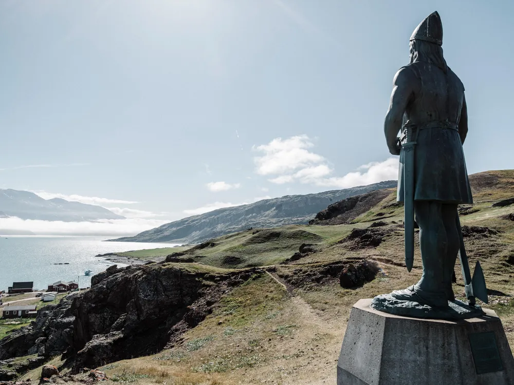 On the grassy slope of a fjord near the southernmost tip of Greenland stand the ruins of a church built by Viking settlers more than a century before Columbus sailed to the Americas. The thick granite-block walls remain intact, as do the 20-foot-high gables. The wooden roof, rafters and doors collapsed and rotted away long ago. Now sheep come and go at will, munching wild thyme where devout Norse Christian converts once knelt in prayer.