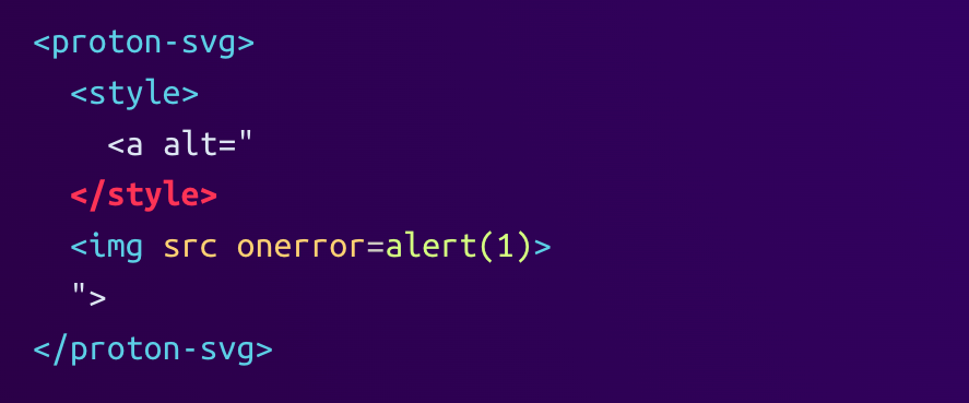 Since the <proton-svg> element belongs to the HTML context, as explained earlier, the parsing rules for the <style> element changed. Its content is now parsed as raw text and the very first occurrence of the byte sequence </style> terminates the element. This causes the <img> element to appear, which in turn executes the onerror handler during rendering. The sanitizer is bypassed!