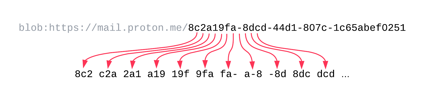 Since the value that needs to be leaked is a blob URL, we can make a few assumptions that simplify the process. Since the origin is always https://mail.proton.me, the beginning of the URL is known to be blob:https://mail.proton.me/. This only leaves the UUID, consisting of hexadecimal characters and dashes, reducing the possibilities per character to 17.