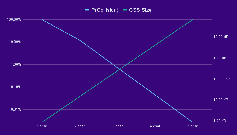 The curious reader might wonder why we chose 3-character chunks in favor of other lengths. We found 3 to be the sweet spot between CSS size and probability of collisions, with the CSS being about 100 KB in size and the chance for a collision being below 1%.