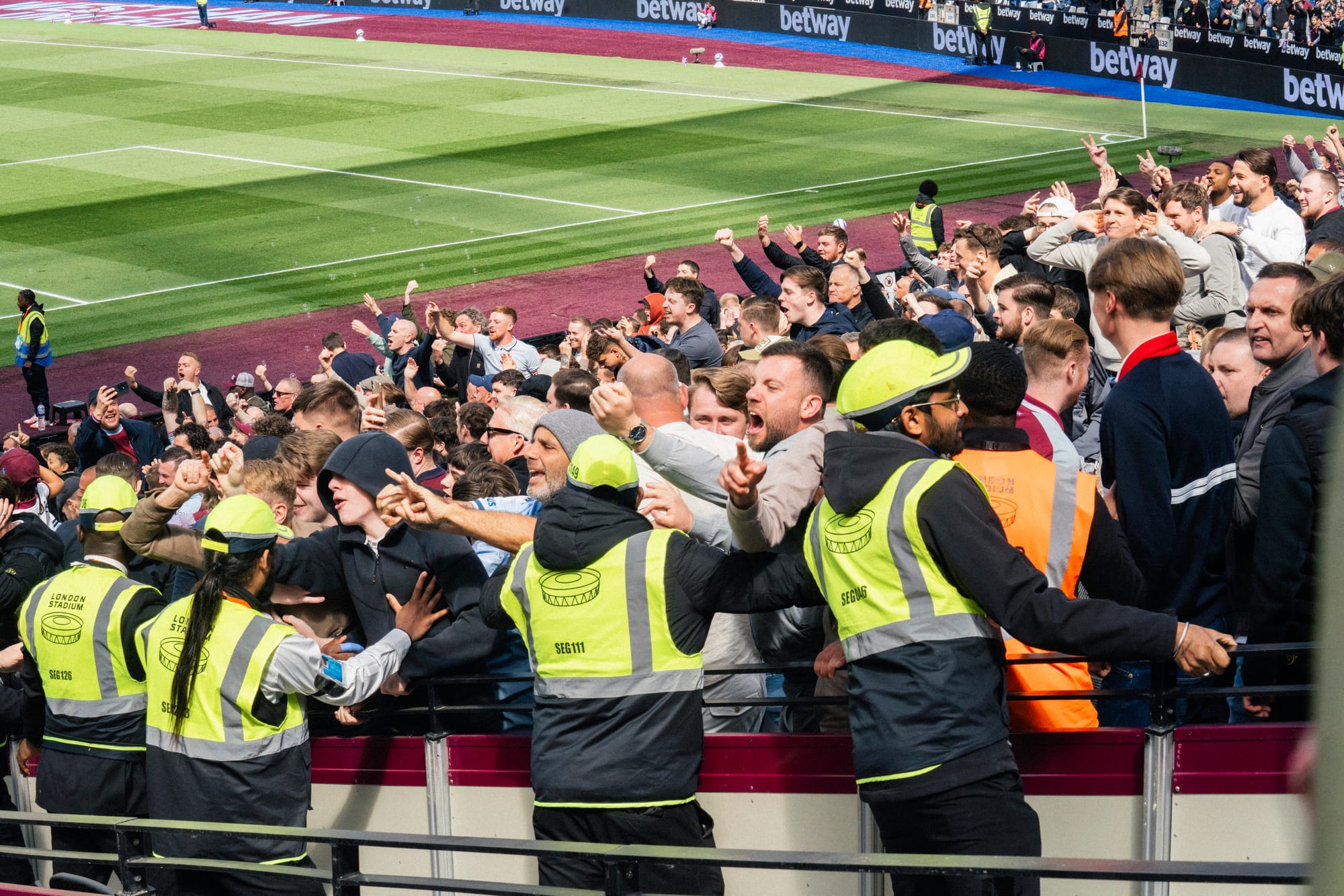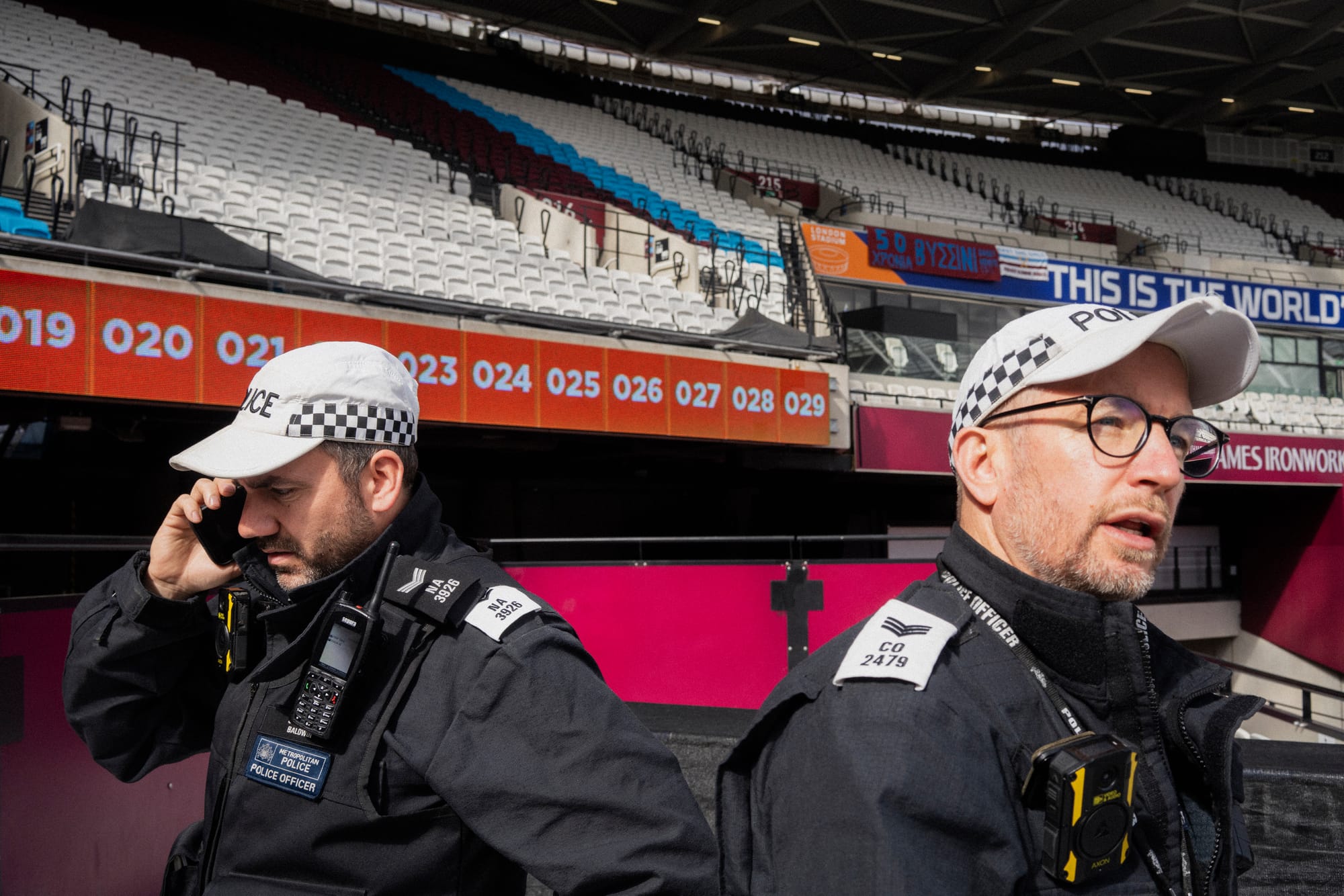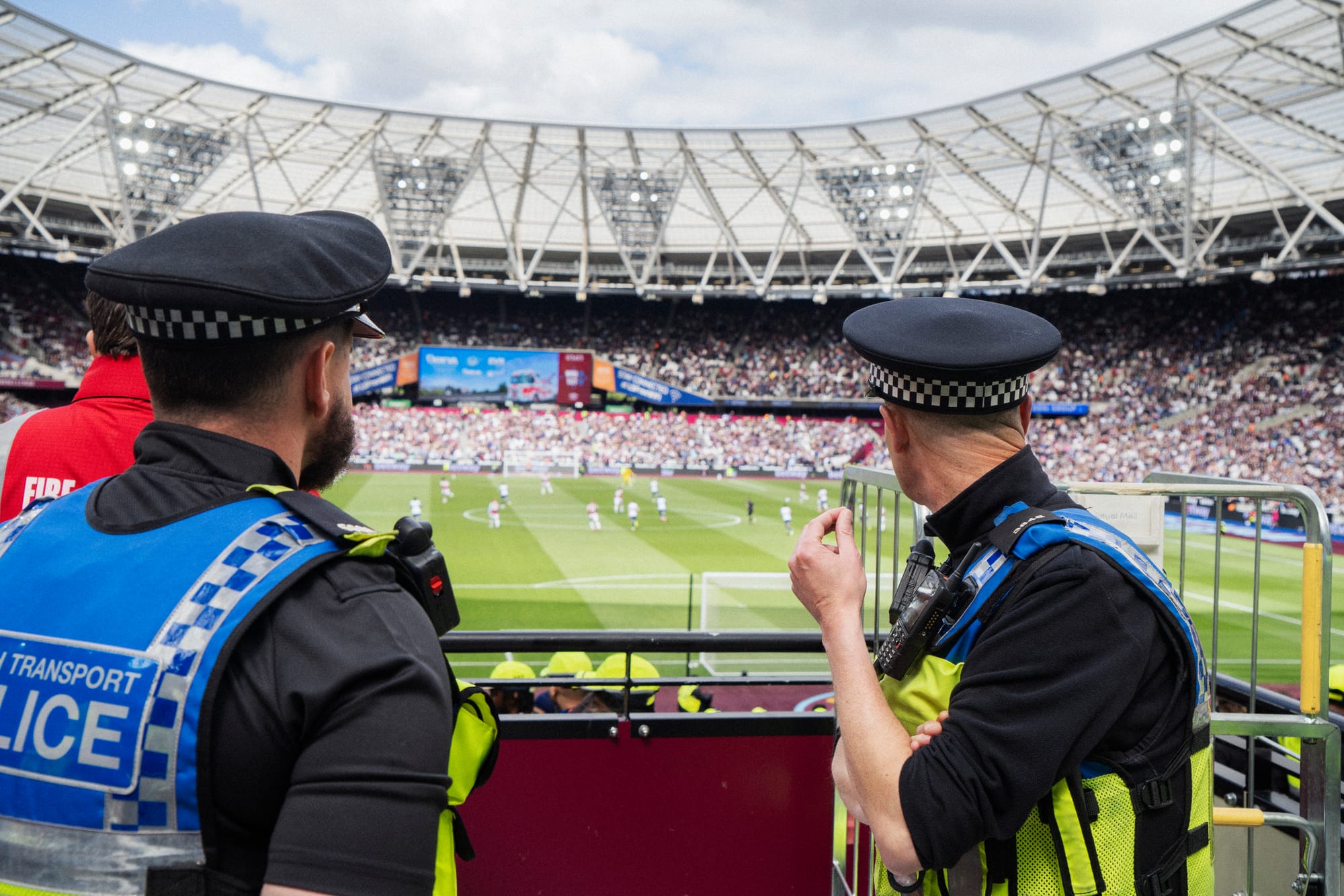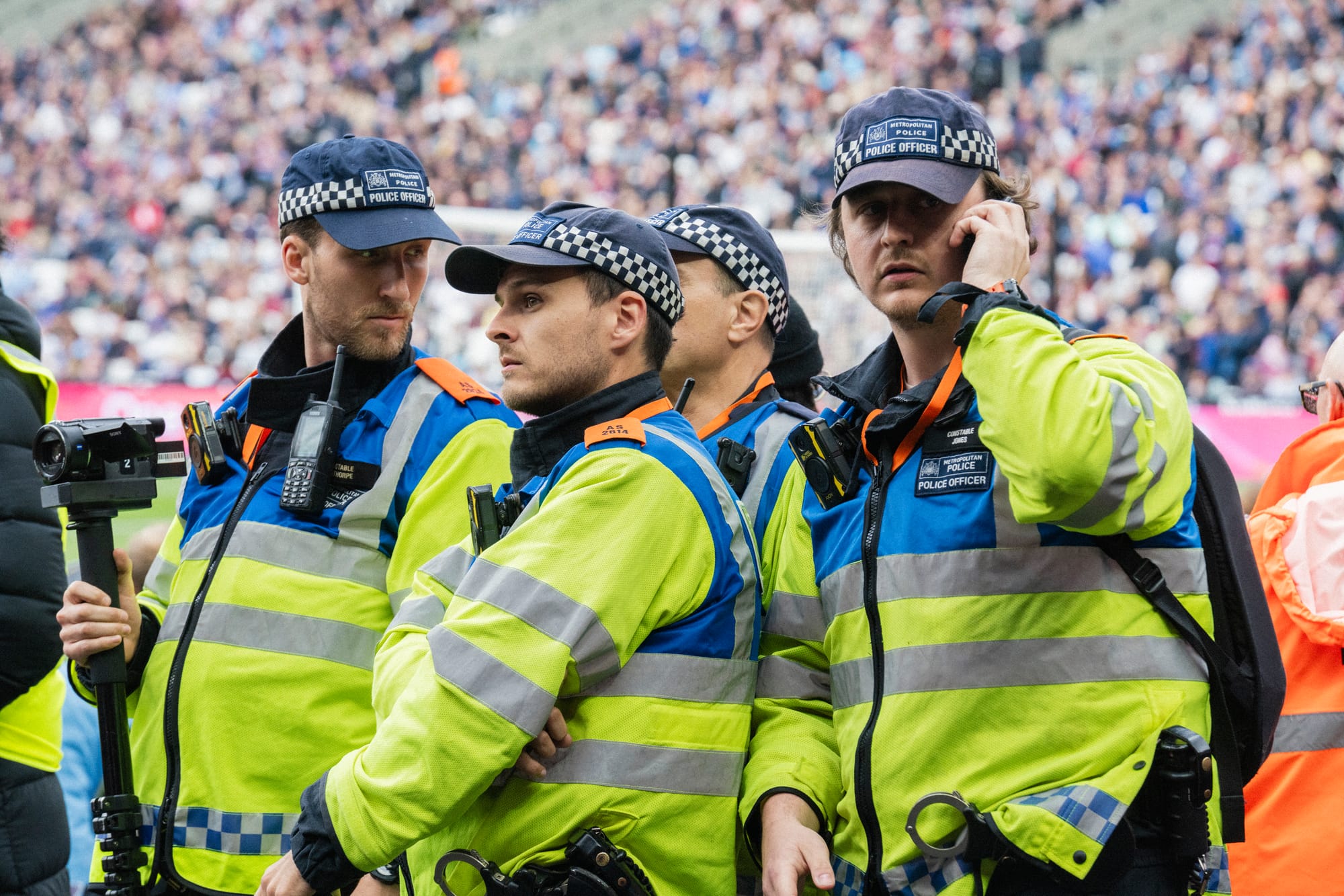 I’m standing alongside football policing officers in the West Ham London Stadiums’ CCTV panopticon, watching operators meticulously replaying a clip of a fan in an attempt to discern the difference between an outraged waving gesture and a Nazi salute. We’ve been granted access to this room, but aren’t allowed to photograph its interior, so I’ll attempt to describe it to you.