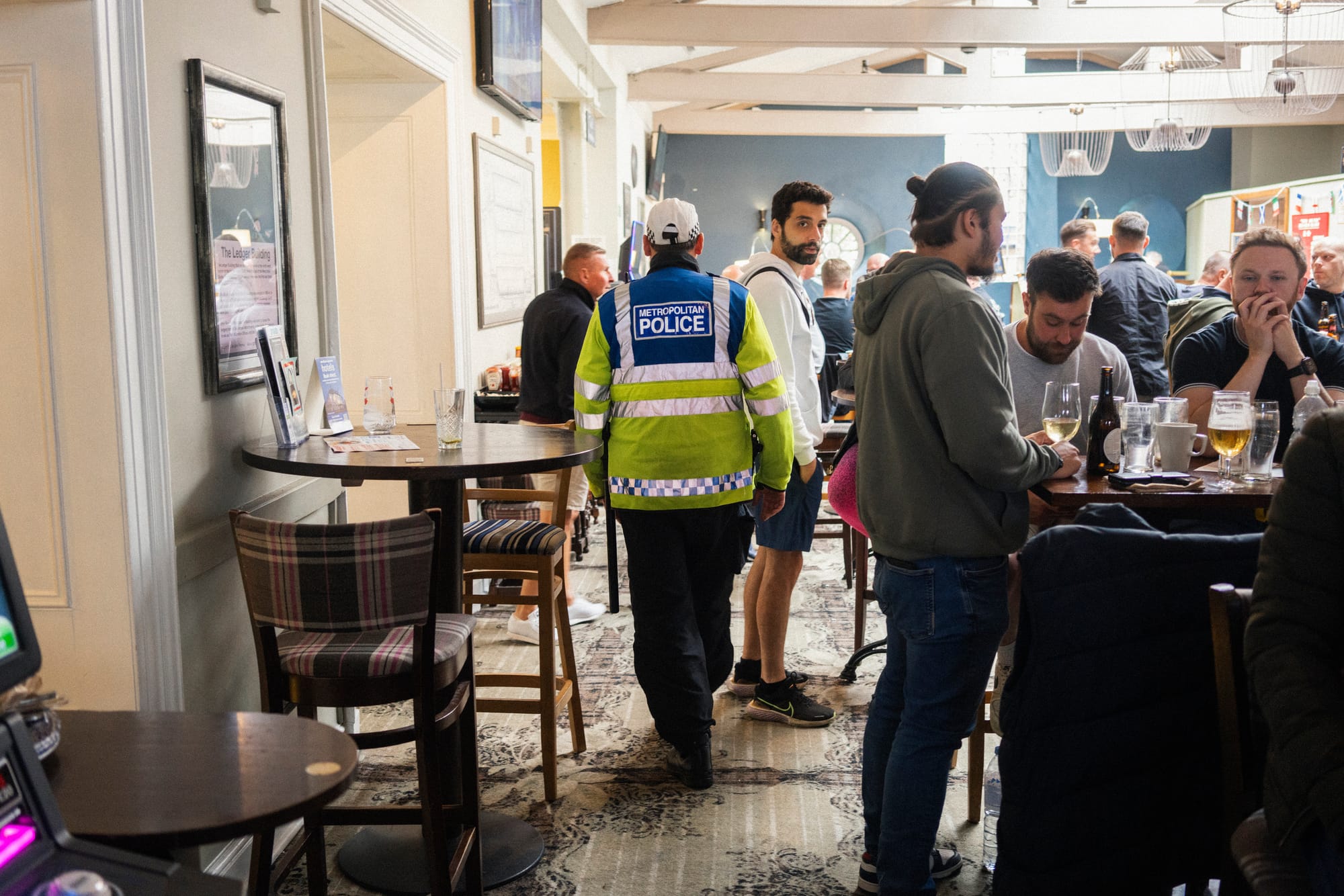 As we pull up at the pub, Jones explains that his team have received intel that a group of high risk Spurs fans have decided to drink there. He can’t tell me how the Football Policing Unit received that information but, according to a former London hooligan I spoke to, it’s almost certainly via a network of snitches. From the moment we arrive, we’re immediately given the stink eye from punters.