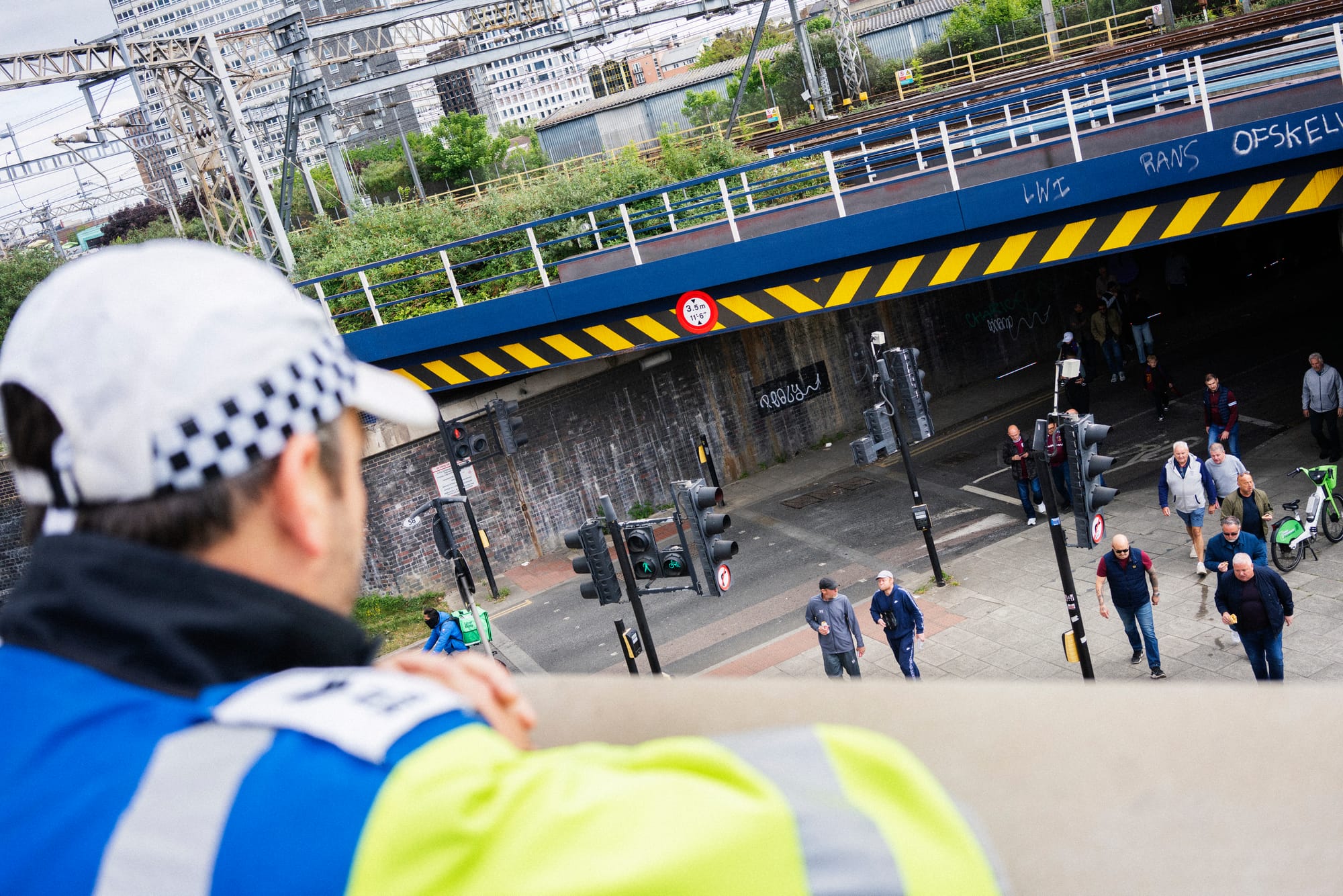 There’s a brief moment of goading when several West Ham fans approach the police line aggressively singing the lyrics of their club anthem “I'm Forever Blowing Bubbles”. The Spurs fans reply in unison. “West Ham are wankers everywhere they go!” The stadium turnstiles — some stadium turnstiles can be programmed with varying “flow rates” to thin out the crowd — mark the end of the walk. Only officers West Ham have paid for are allowed beyond this point. The rest form ranks. Jones and his fellow spotters seem pleased with themselves so far.