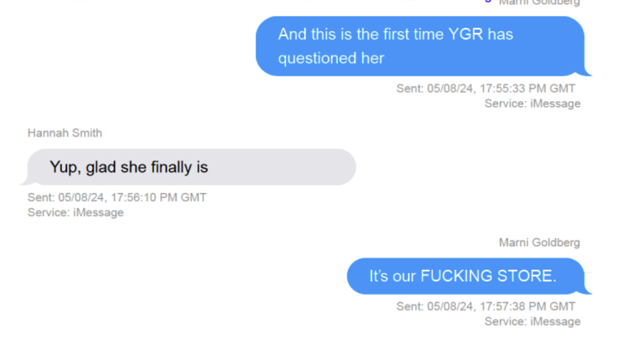 It’s worth speculating on the attitude of Apple’s CEO Tim Cook as he refused to comply. There’s more here than just financial calculation in flouting a judicial order, as disobeying a direct court order is unusually aggressive. I believe that what is happening is that Cook feels mistreated, and is acting accordingly. Here’s a text message chain that came out in the trial from communications chief Marni Goldberg, illustrating the view that Cook likely holds. Often, true believer employees reflect the views of their boss, so that could be happening here. In this text message, Goldberg is discussing how the judge is acting during the case.