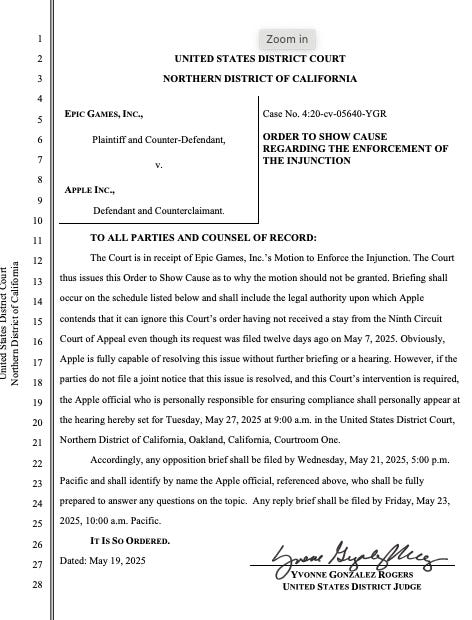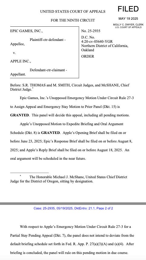 Also, I misread the appeals court deadline. The briefing schedule for the emergency halt to the order is faster than I realized. Epic Games had its brief due yesterday, and Apple’s response is due on Tuesday, May 27th. Apple asked for relief by May 28th, but appeals court said indifferently that "the panel will rule on this pending motion in due course.”