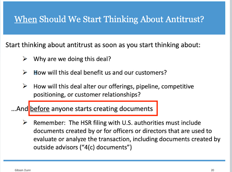 The government was blind, and deal-makers liked it that way. (Indeed, here’s a slide from biglaw firm Gibson Dunn marketing their antitrust services to prospective clients. I highlighted the bit in red, which makes it clear what these antitrust lawyers really do.)