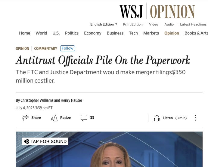 Six weeks ago, the government put out an anodyne press release, designed to put normal people to sleep. It was titled “FTC and DOJ Propose Changes to HSR Form for More Effective, Efficient Merger Review,” and it was accompanied with a long and equally boring notification in the Federal Register, which is the official journal of the U.S. government. The Federal Register publishes hundreds of pages every day, full of announcements of new rules and minor changes to government forms. Most days, it’s not something to pay attention to.