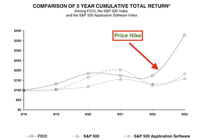 But recently, that dynamic changed. In 2022, FICO announced a series of what would become an aggregate 500% price increase for the mortgage industry over the next two years. The reason is likely that the firm’s CEO, Will Lansing, had significant payment contingent on the stock price performance in 2023. And it worked, Lansing was the fifth highest paid CEO in America that year. And though FICO claims it doesn’t set the overall price for credit scores (though many in the industry are skeptical), its stock price reflected much higher margins.