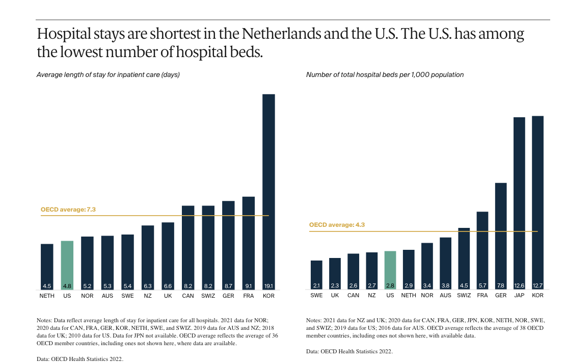 In 2003, four scholars published a famous article titled It’s the Prices, Stupid, finding the U.S. pays more and consumes less on health care than peer countries. Though we spend twice as much, the U.S. has fewer doctors per capita, fewer hospital beds per capita, and among the shortest hospital stays than other rich nations. We just pay more for what we get. These scholars reran the study in 2019, after various reforms, and found the problem was the same. Embedded in the prices for services, as Breunig notes, are staggering administrative costs.