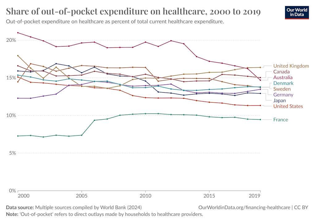 To support this view, Smith makes a couple of points. First, he argues insurance just isn’t very profitable. UnitedHealth Group has a profit margin of six percent, which is half of the margin of normal public companies. The company makes a lot of money, with a net income of $23 billion in 2023, but that’s small compared to the $371 billion in overall revenue, $241.9 billion of which, he says, is paid out in medical costs. Second, out of pocket expenses are lower percentage-wise than what people in other countries experience. He puts this chart up. We don’t pay more more out of pocket percentage-wide, it’s just the level of cost is far too high, because of ‘providers.’