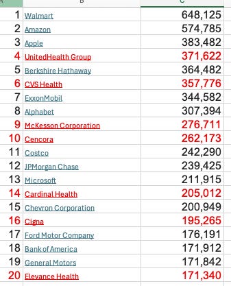 And this dynamic isn’t just a function of insurers buying up and down the value chain. Everyone is smooshing together. In Pennsylvania, giant hospital systems are taking over the insurance industry, drug distributors are buying oncology clinics, and even Kaiser - perhaps the only integrated system that actually delivers real integrated care - is expanding into a more assertive financialized model. Here’s a list of the top twenty corporations in America by revenue. Seven are health conglomerates, all of which have many different lines of business.