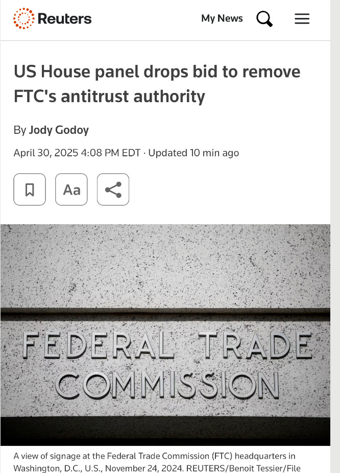 And now on to the second piece of good news. On Monday, I traced a proposal from Republican leader Jim Jordan, who chairs the House Judiciary Committee, to eliminate a key antitrust law, which is the Federal Trade Commission’s authority to ban “unfair methods of competition.” That’s the authority used in several important cases, including one involving Amazon, another targeting UnitedHealth Group and CVS, as well as a seed and chemical case where the defendants are Corteva and Syngenta. The committee hearing was today, and Jordan ultimately pulled the proposal.