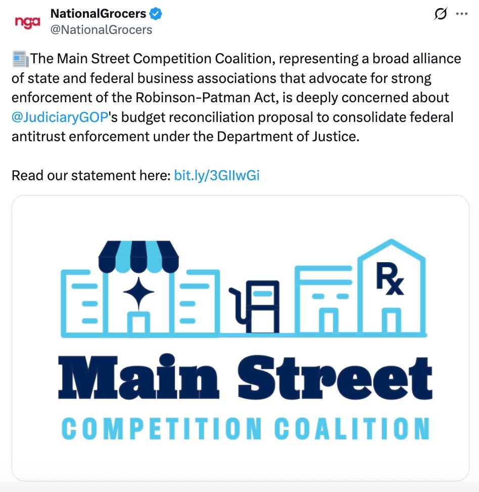 But that’s not all. There are a lot of business people, like pharmacists, app developers, grocers, and farmers who are reliant on the increasingly active antitrust enforcement regime. And some of them no doubt started getting into contact with GOP members on the committee. It’s rare for trade associations to move particularly quickly, but the National Grocers Association, which leads a coalition seeking to revive price discrimination laws, put out a note of concern.
