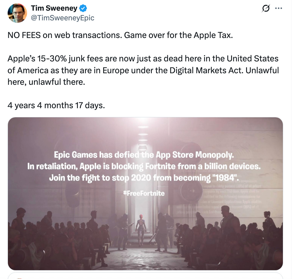 In 2021, Epic Games lost on the Federal antitrust charges, but won on a state claim of unfair conduct, specifically over its refusal to let app developers communicate with or give consumers a place outside of the app store to pay for apps. The judge found that Apple’s conduct “allowed it to reap supracompetitive operating margins,” and ordered it to let app developers communicate with customers and buy apps outside the App store. The case went on appeal, with the Ninth Circuit upholding the decision and order. In January of 2024, the Supreme Court refused to hear the appeal, and Gonzalez Rogers’s order went into effect.