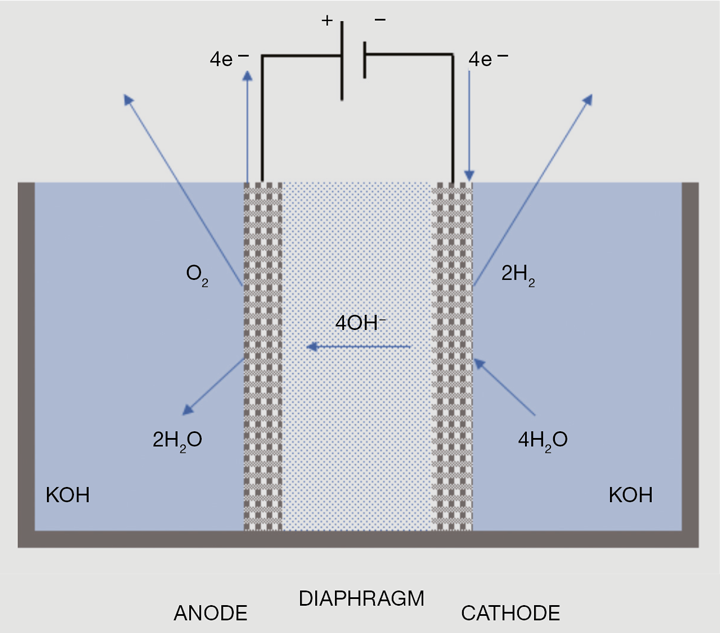 Alkaline electrolysers were the first commercialised electrolysis system and remain the most mature and widely used system for hydrogen production. Two electrodes, an anode and a cathode, often manufactured from nickel are immersed in a conductive electrolyte. A 30% aqueous solution of potassium hydroxide (KOH) is commonly used as the electrolyte to enhance ionic conductivity. However, sodium hydroxide (NaOH) can also be used. The separator is used to allow the migration of hydroxide anions (OH-) and avoid the mixing of hydrogen and oxygen gas generated. Despite the fact that it is an established technology, there are a number of technical disadvantages associated with alkaline electrolysers. This includes the use of corrosive electrolyte, low current density, limited turndown ratio and inability to operate at high pressures. A schematic is illustrated in Figure 1.
