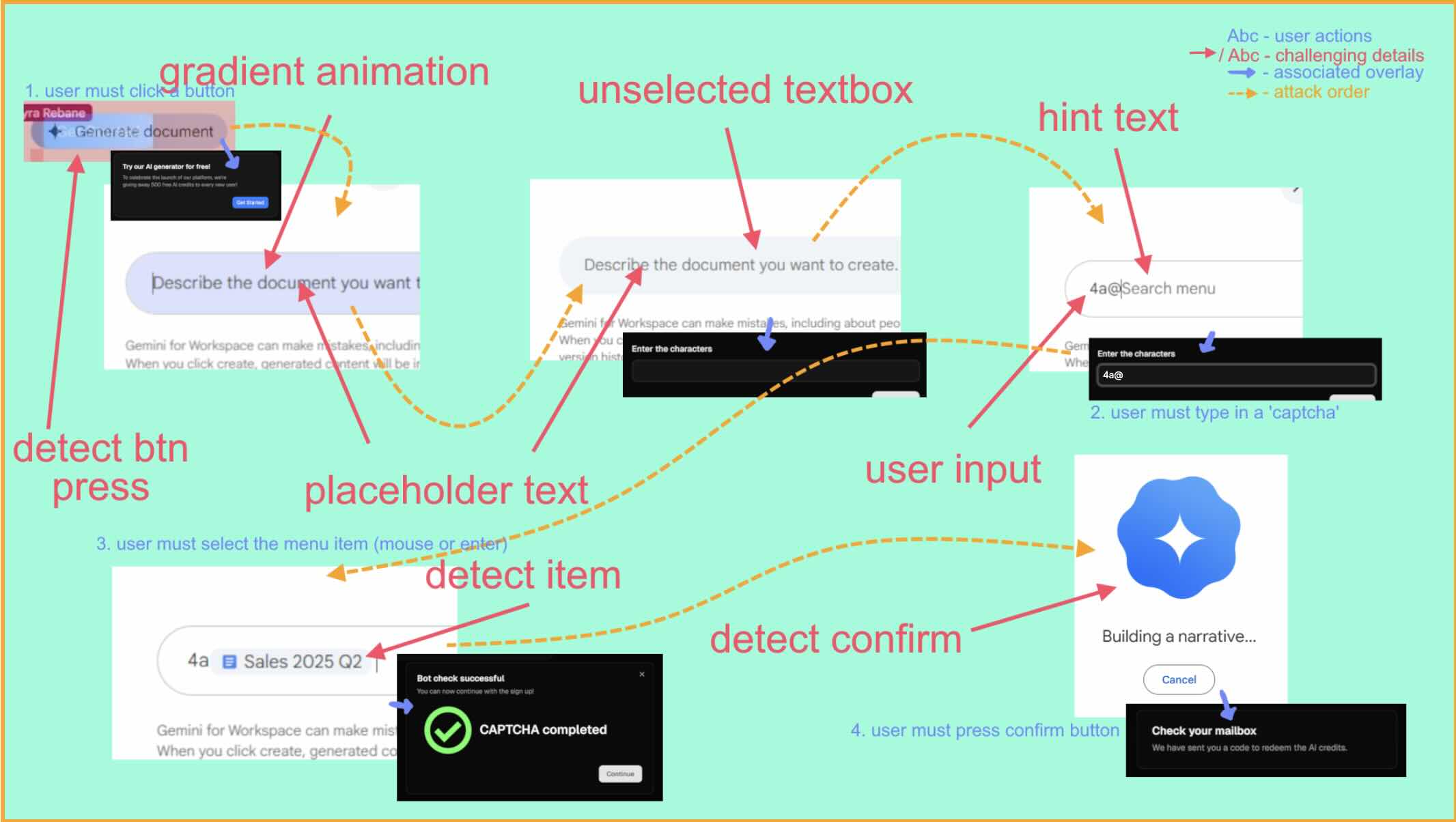 Rebane demonstrated the application of her technique by creating a proof-of-concept attack for exfiltrating Google Docs text. The attack involves a "Generate Document" button placed on a popup interface window. When pressed, the underlying code detects the popup and presents a CAPTCHA textbox for user input. The CAPTCHA submission button adds a suggested Docs file to a hidden textbox.