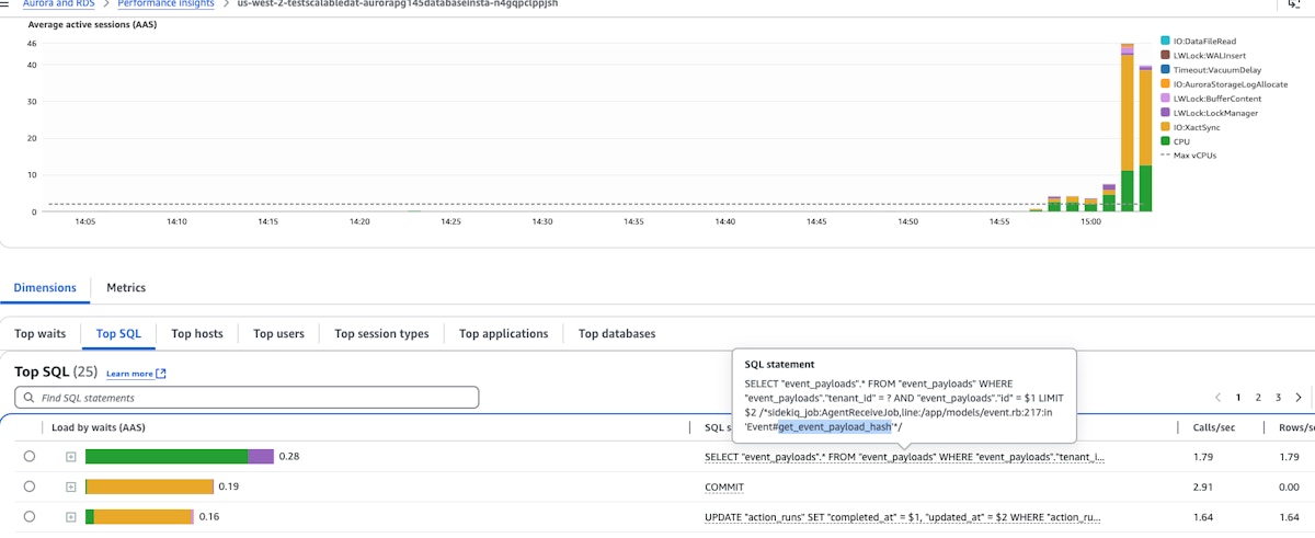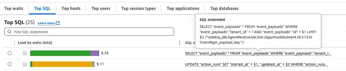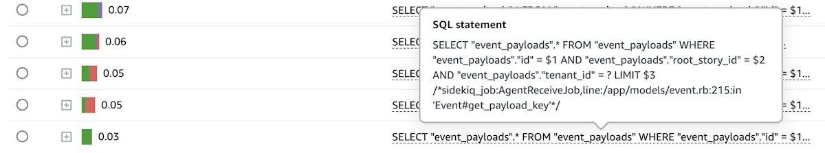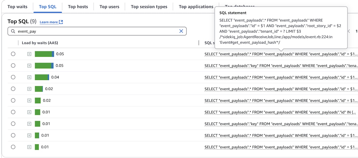 Vs. after reverse engineering (notice no SELECTs on event_payloads generated enough load to be displayed anymore):