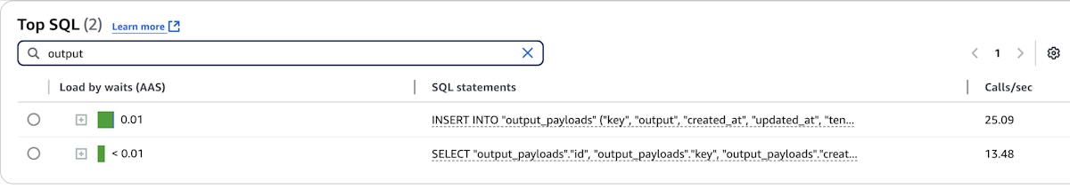 Deciding on a partitioning strategy was just the beginning of this project. Next, we set up the partitions as described in Strategy 4 on a test cluster. With the partitions in place, our general approach was to deploy code that relied on the event_payloads table everywhere we currently used the output_payloads table, load test, analyze performance, make adjustments, repeat. Load testing meant running a few busy stories on the test cluster, generating tons of writes and reads on the table. We tracked the performance in AWS Aurora/RDS console, identifying queries that caused high database load. We used PostgreSQL’s EXPLAIN ANALYZE tool in order to see how PostgreSQL was planning and executing resource intensive queries. From there, we could look for ways to optimize.