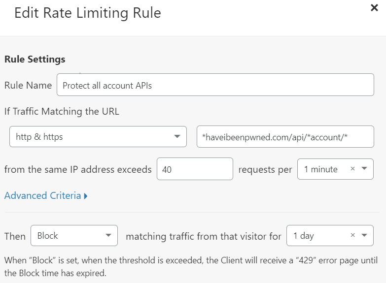 One last thing on the rate limit: because it's no longer locking you out for a day if exceeded, making too many requests results in a very temporary lack of service (usually single digit seconds). If you're consuming the new auth'd API, handle HTTP 429 responses from HIBP gracefully and ask the user to try again momentarily. Now, with that said, let me give you the code to make it dead easy to both proxy those requests and control the rate at which your subscribers hit the service; here's how to do it with Cloudflare workers and rate limits: