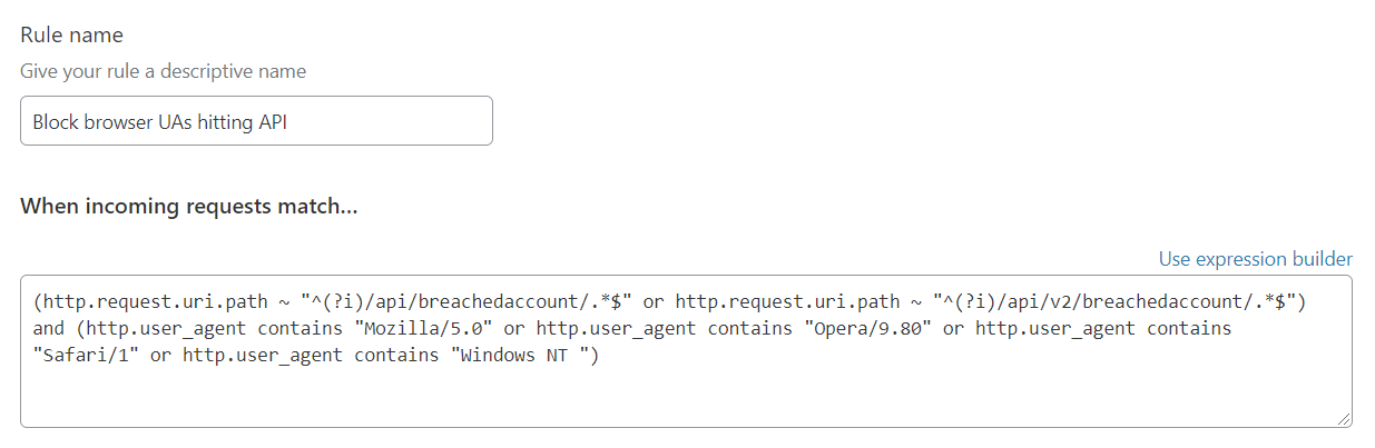 So how about looking at user agent strings instead? I mean could always just block the ones bad actors are using, except that was never going to work particularly well for obvious reasons (you can always define whatever one you like). That said, there were a heap of browser UAs which clearly were (almost) never legitimate for a client making API calls. So I blocked these as well: