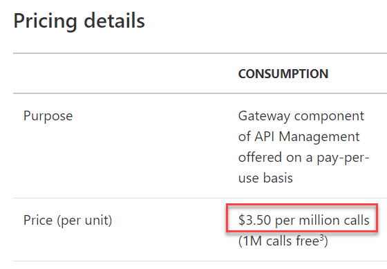 This is from the Azure API Management pricing page which is the service I'm using to provision keys and control rate limits (I'll write a more detailed post on this later on - it's kinda awesome). I chose the $3.50 figure because it represents someone making one million calls. Some people will make much less, some much more - that rate limit represents a possible 1.785 million calls per month. Plus, there's still the costs of function executions, storage queries and egress bandwidth to consider, not to mention the slice of the $3.50 that Stripe takes for processing the payment (all charges are routed through them). The point is that the $3.50 number is pretty much bang on the mark for the cost of providing the service.