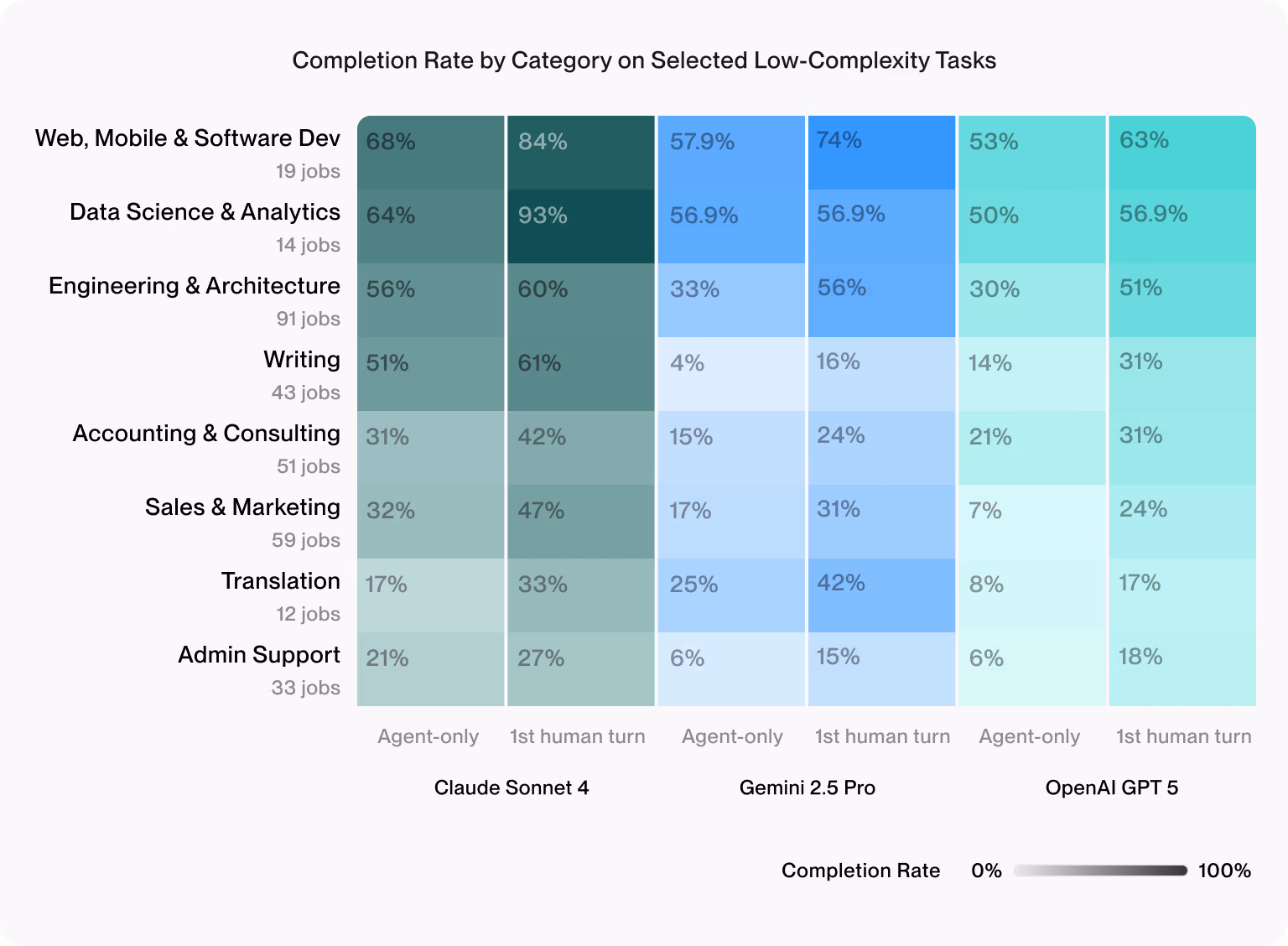 Results showed that agents performed best on structured, technical work such as coding and data science jobs. However, across categories, the inclusion of human expertise amplified impact leading to higher completion rates — not only in creative fields like writing, sales and marketing, and translation, but also in technical areas like web, mobile & software development.