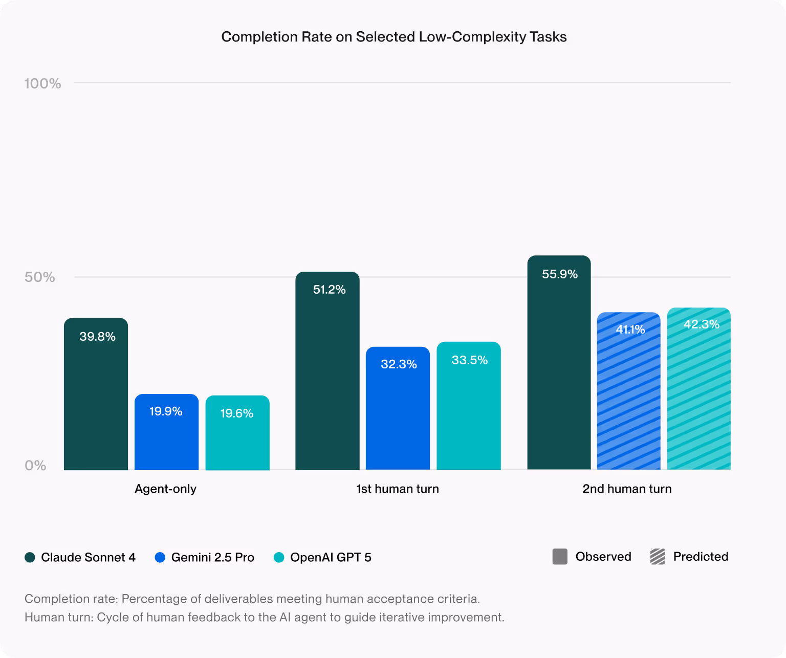 The benchmark measures completion rate, the percentage of jobs where 100% of acceptance criteria from the rubric are met. We found that human+agent collaboration increased job completion rates by up to 70% compared to agents working alone. Deliverables were scored before and after each cycle of freelancer feedback. Each iteration benchmarked how human feedback improved the final result, revealing where collaboration with agents drove the greatest improvements.