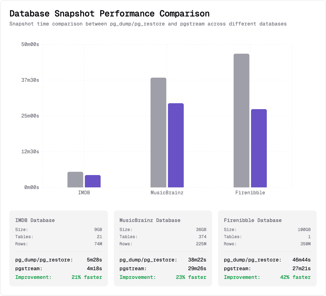 Since the snapshot process doesn’t require validating foreign keys or check constraints mid-import, we borrowed this pattern. We isolated index/constraint/trigger creation and moved it to after the data load. Testing against the same IMDb dataset showed a significant win; pgstream snapshots were now faster than pg_dump/pg_restore!