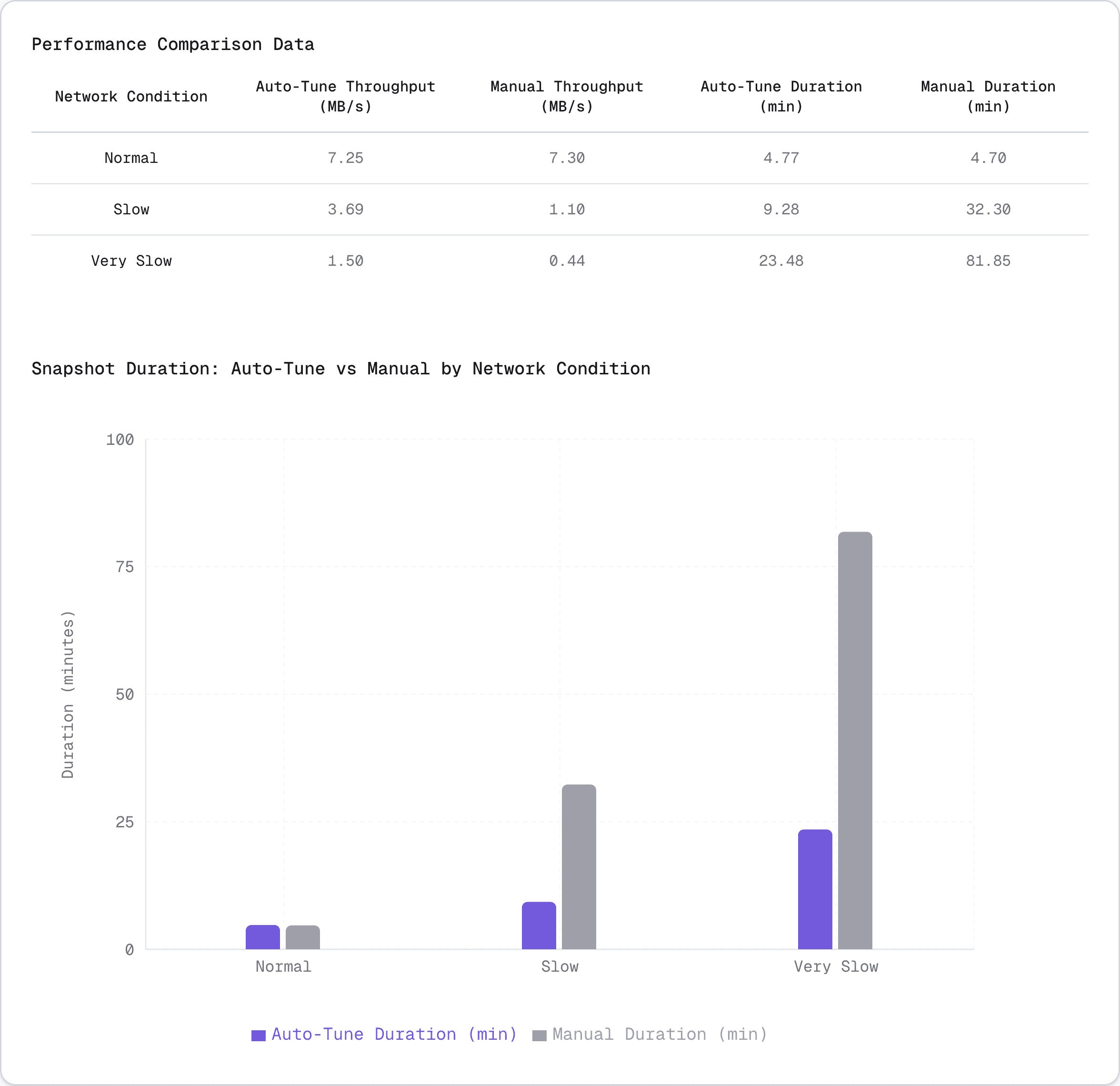 In very slow networks, the default 80 MB configuration caused catastrophic performance degradation. The oversized batches led to network buffer saturation, increased timeouts and memory pressure, with the system throughput dropping to 422 kB/s by the end. Auto-tune's 49.7 MB selection completed in 23 minutes vs 1h 22 minutes - a 3.5x speedup! 🏎️