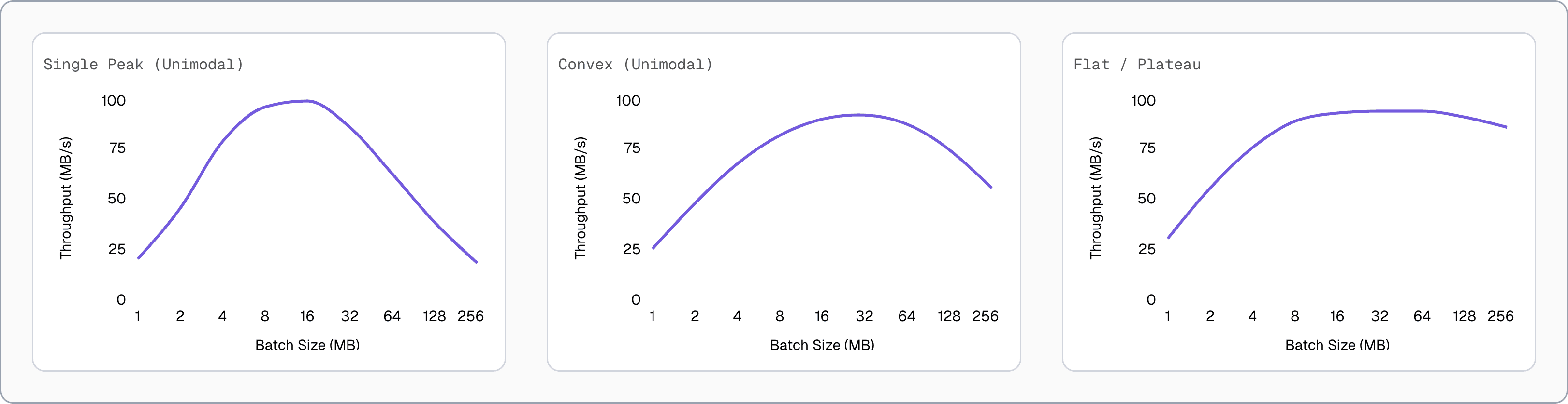 This algorithm works best when throughput follows a single peak or a mostly flat curve, which is a common pattern in network-bound workloads. As batch size increases, throughput typically improves up to the point where latency, buffering, or congestion start to dominate, after which gains level off or drop. In these conditions, the algorithm can reliably move toward higher throughput and converge on a good batch size.