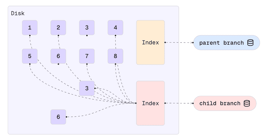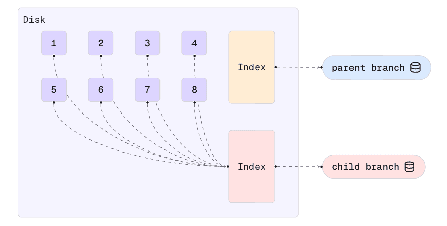 When a new branch is created, a new metadata index is created, but no data chunks are copied. The new branch’s index simply points to the existing chunks. This is why the branch operation is instant: it doesn’t (yet) have to copy any significant amount of data.
