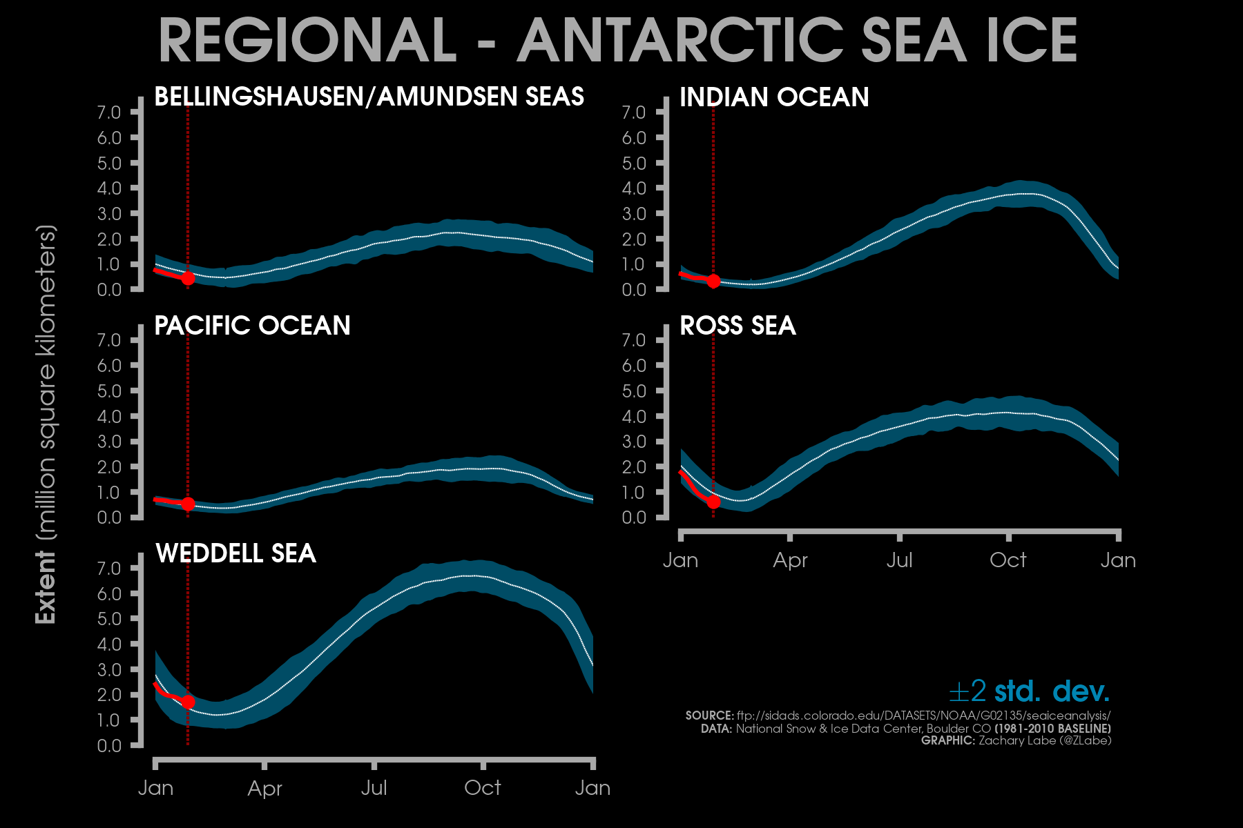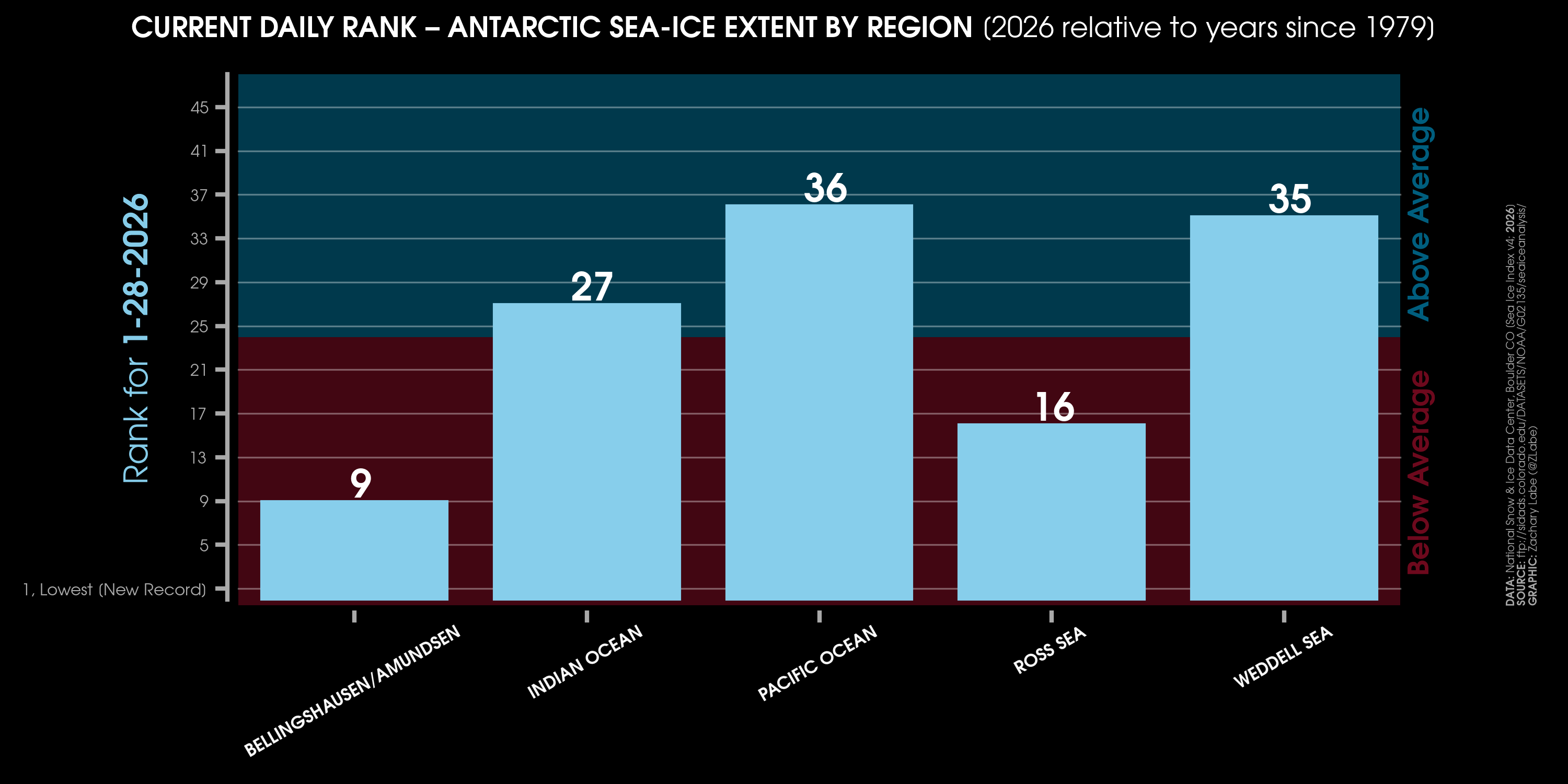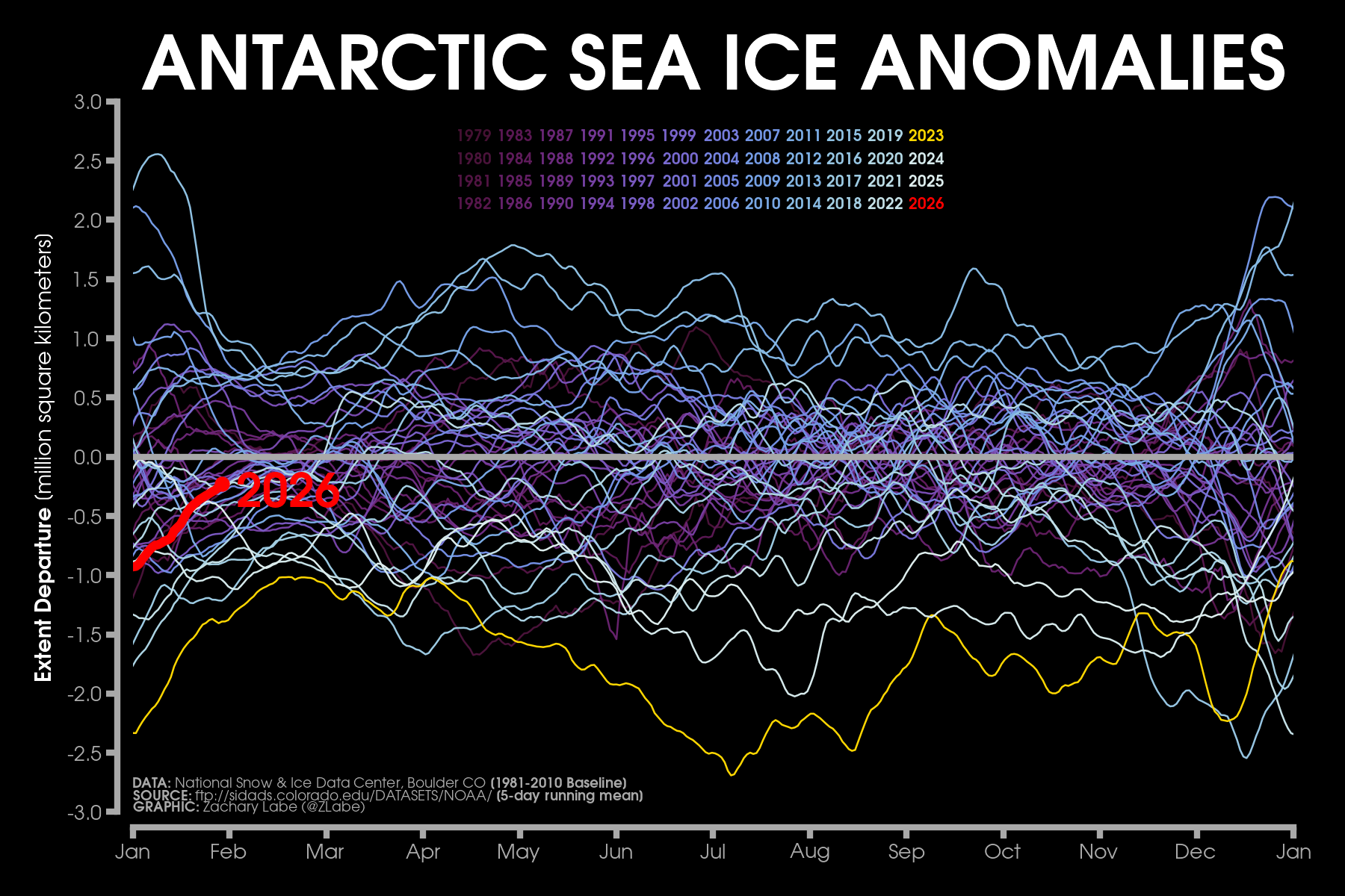 Current Antarctic sea ice extent (NSIDC, DMSP SSM/I-SSMIS F-18 and JAXA AMSR2) in addition to climatology (blue, 1981-2010) and 2 standard deviations from the mean (updated 1/30/2026)Monthly averaged Antarctic sea-ice concentration for December 2025 (left) and its anomalies relative to 1981-2010 (right). Data from NRT NOAA/NSIDC CDR of Passive Microwave Sea Ice Concentration v4 (https://doi.org/10.7265/tm2n-1m33); ice concentration updated with up to a 1-month lag. Graphic created on 1/17/2026.[Special (temporary) graphic to monitor the ongoing record low] Antarctic sea ice extent for each year from 1979 to 2026 (satellite-era; NSIDC, DMSP SSM/I-SSMIS and JAXA AMSR2). 2026 is shown using a red line (updated 1/30/2026).[Special (temporary) graphic to monitor the ongoing record low] Antarctic sea ice extent for each year from 1979 to 2026 (satellite-era; NSIDC, DMSP SSM/I-SSMIS and JAXA AMSR2). 2024 is highlighted with a yellow line. 2026 is shown using a red line (updated 1/30/2026).Antarctic sea ice extent anomalies for each year from 1979 to 2026 (satellite-era; NSIDC, DMSP SSM/I-SSMIS and JAXA AMSR2). Anomalies are calculated using a 5-day running mean from a climatological baseline of 1981-2010. 2023 is shown with a yellow line. 2026 is shown using a red line (updated 1/30/2026).Antarctic sea ice extent anomalies stretching from January 1979 to present day (satellite-era; NSIDC, DMSP SSM/I-SSMIS and JAXA AMSR2). Anomalies are calculated using a 5-day running mean from a climatological baseline of 1981-2010 (updated 1/30/2026).Current regional Antarctic sea ice extents (NSIDC Sea Ice Index v4 : DMSP SSM/I-SSMIS F-18 and JAXA AMSR2) for 2026 (red line) and for each year through the satellite era (blue [1979] to white [2025] lines). A map of the regions can be found at https://nsidc.org/arcticseaicenews/map-of-antarctica/. Graphic updated 1/30/2026.Daily rank for regional Antarctic sea ice extents (NSIDC Sea Ice Index v4 : DMSP SSM/I-SSMIS F-18 and JAXA AMSR2) over the satellite-era (1979-2026). A map of the regions can be found at https://nsidc.org/arcticseaicenews/map-of-antarctica/. A rank of “1” is the lowest on record for a given region. A rank of “48” is the highest sea-ice extent on record for a given region. Graphic is updated for the ranks on 1/30/2026.Current regional Antarctic sea ice extents (NSIDC Sea Ice Index v4; DMSP SSM/I-SSMIS F-18 and JAXA AMSR2) in addition to 2 standard deviations from the 1981-2010 mean (updated 1/30/2026).Current simulated (GIOMAS; Zhang and Rothrock, 2003) sea ice thickness and anomalies (1981-2010 baseline) updated for December 2025. For more information on this ice-ocean reanalysis dataset, see https://tc.copernicus.org/articles/16/1807/2022/.Latest GIOMAS model (Zhang and Rothrock, 2003) simulated sea ice volume (SIV) averaged for the Southern Hemisphere (Antarctic). Volume is averaged for each month from 1979 to 2025. Graphic updated through December 2025.Monthly Antarctic sea ice volume anomalies stretching from January 1979 to December 2025 (GIOMAS; Zhang and Rothrock, 2003). Anomalies are calculated from a climatological baseline of 1981-2010 (updated 1/18/2026).Current simulated (GIOMAS; Zhang and Rothrock, 2003) sea ice thickness averaged over each year from 1979 to 2025. Updated 1/18/2026.Since sea ice thickness observations are sparse, we utilize the GIOMAS model (Zhang and Rothrock, 2003) to visualize sea ice thickness averaged for each year from 1979 to 2025. For more information on this ice-ocean reanalysis dataset, see https://tc.copernicus.org/articles/16/1807/2022/. Updated 1/18/2026.
