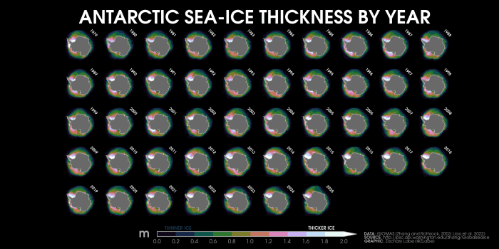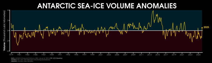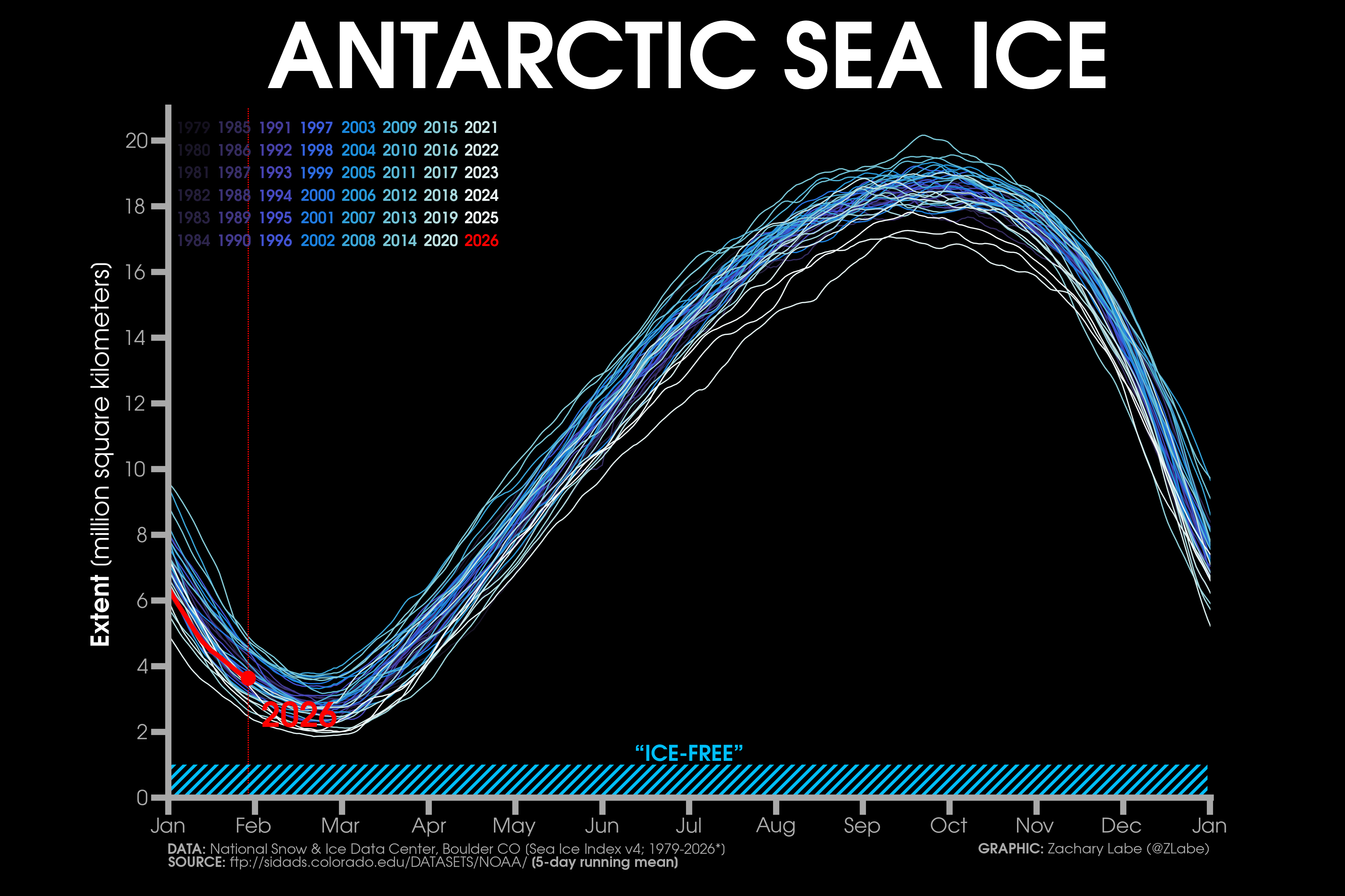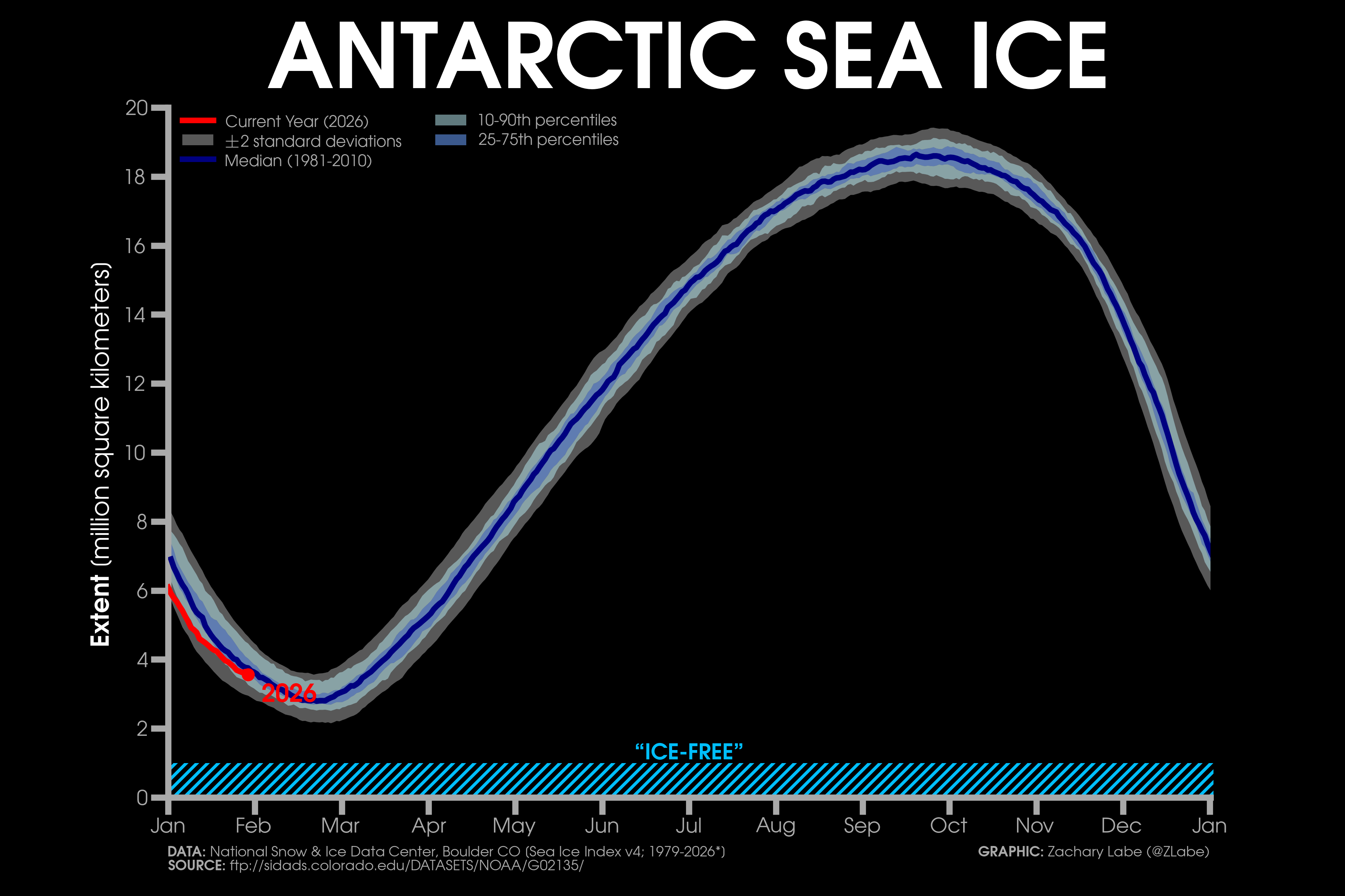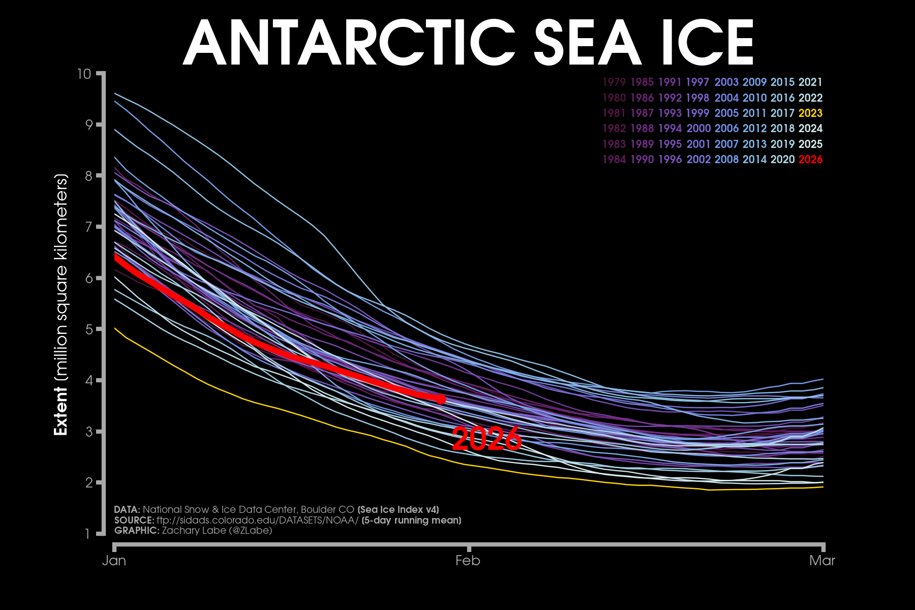 Current Antarctic sea ice extent (NSIDC, DMSP SSM/I-SSMIS F-18 and JAXA AMSR2) in addition to climatology (blue, 1981-2010) and 2 standard deviations from the mean (updated 1/30/2026)Monthly averaged Antarctic sea-ice concentration for December 2025 (left) and its anomalies relative to 1981-2010 (right). Data from NRT NOAA/NSIDC CDR of Passive Microwave Sea Ice Concentration v4 (https://doi.org/10.7265/tm2n-1m33); ice concentration updated with up to a 1-month lag. Graphic created on 1/17/2026.[Special (temporary) graphic to monitor the ongoing record low] Antarctic sea ice extent for each year from 1979 to 2026 (satellite-era; NSIDC, DMSP SSM/I-SSMIS and JAXA AMSR2). 2026 is shown using a red line (updated 1/30/2026).[Special (temporary) graphic to monitor the ongoing record low] Antarctic sea ice extent for each year from 1979 to 2026 (satellite-era; NSIDC, DMSP SSM/I-SSMIS and JAXA AMSR2). 2024 is highlighted with a yellow line. 2026 is shown using a red line (updated 1/30/2026).Antarctic sea ice extent anomalies for each year from 1979 to 2026 (satellite-era; NSIDC, DMSP SSM/I-SSMIS and JAXA AMSR2). Anomalies are calculated using a 5-day running mean from a climatological baseline of 1981-2010. 2023 is shown with a yellow line. 2026 is shown using a red line (updated 1/30/2026).Antarctic sea ice extent anomalies stretching from January 1979 to present day (satellite-era; NSIDC, DMSP SSM/I-SSMIS and JAXA AMSR2). Anomalies are calculated using a 5-day running mean from a climatological baseline of 1981-2010 (updated 1/30/2026).Current regional Antarctic sea ice extents (NSIDC Sea Ice Index v4 : DMSP SSM/I-SSMIS F-18 and JAXA AMSR2) for 2026 (red line) and for each year through the satellite era (blue [1979] to white [2025] lines). A map of the regions can be found at https://nsidc.org/arcticseaicenews/map-of-antarctica/. Graphic updated 1/30/2026.Daily rank for regional Antarctic sea ice extents (NSIDC Sea Ice Index v4 : DMSP SSM/I-SSMIS F-18 and JAXA AMSR2) over the satellite-era (1979-2026). A map of the regions can be found at https://nsidc.org/arcticseaicenews/map-of-antarctica/. A rank of “1” is the lowest on record for a given region. A rank of “48” is the highest sea-ice extent on record for a given region. Graphic is updated for the ranks on 1/30/2026.Current regional Antarctic sea ice extents (NSIDC Sea Ice Index v4; DMSP SSM/I-SSMIS F-18 and JAXA AMSR2) in addition to 2 standard deviations from the 1981-2010 mean (updated 1/30/2026).Current simulated (GIOMAS; Zhang and Rothrock, 2003) sea ice thickness and anomalies (1981-2010 baseline) updated for December 2025. For more information on this ice-ocean reanalysis dataset, see https://tc.copernicus.org/articles/16/1807/2022/.Latest GIOMAS model (Zhang and Rothrock, 2003) simulated sea ice volume (SIV) averaged for the Southern Hemisphere (Antarctic). Volume is averaged for each month from 1979 to 2025. Graphic updated through December 2025.Monthly Antarctic sea ice volume anomalies stretching from January 1979 to December 2025 (GIOMAS; Zhang and Rothrock, 2003). Anomalies are calculated from a climatological baseline of 1981-2010 (updated 1/18/2026).Current simulated (GIOMAS; Zhang and Rothrock, 2003) sea ice thickness averaged over each year from 1979 to 2025. Updated 1/18/2026.Since sea ice thickness observations are sparse, we utilize the GIOMAS model (Zhang and Rothrock, 2003) to visualize sea ice thickness averaged for each year from 1979 to 2025. For more information on this ice-ocean reanalysis dataset, see https://tc.copernicus.org/articles/16/1807/2022/. Updated 1/18/2026.